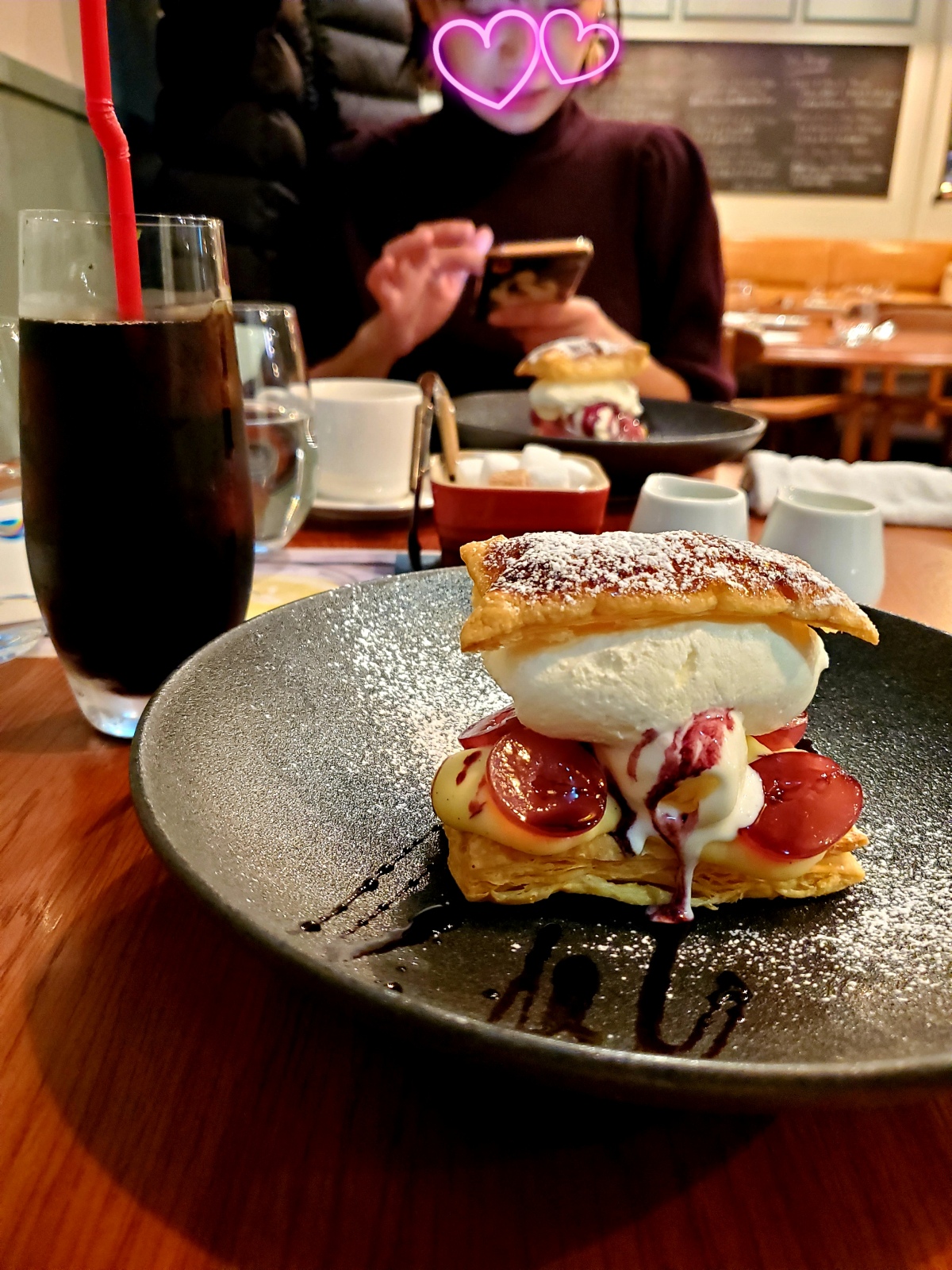 忘年会その1 お使いがてらまさよんとランチしてお茶。昨夜、気づいてびっくりだったけどランチのお店ランチタイムは、一日一組それも、カウンター💦でも、快適だった。ワンコダメか?聞いてみたかったけど初回につき、聞けませんでした(笑)お茶は、三越で🍰